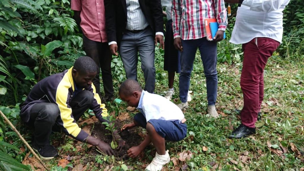 Les parties prenantes de conservation tenant des plantules sous le leadership de Mr. Jean Claude Maindo (veste chocolat)